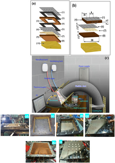 Experimental test rig for handling the enclosure: (a,b) enclosure parts—(1) upper copper plate (cold surface), (2) sheet of a gasket, (3) two-directional valve, (4) square cuboid enclosure, (5) sheet of the gasket, (6) bottom copper plate (hot surface), (7) heater, (8) Bakelite insulator sheet, (9) thermocouples, and (10) insulation cover; (c) complete assembled setup; (d–i) images taken during preparation of the enclosures.