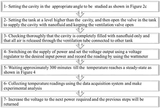 Figure 3 summarizes the preliminary procedures that must be performed before starting the experiment and collecting data. It is important also to ensure that there are no gases or bubbles present while filling the cavity with nanofluid. This is accomplished by shaking the cavity repeatedly until all possible bubbles remaining inside the cavity have escaped through the ventilation tank. Furthermore, after each experiment with a specified nanofluid concentration, the cavity was washed three times with water to ensure that no residue from the previous concentration was left over. Figure 4a, b show the steady-state temperature for a variety of heat fluxes at both the hot and cold surfaces, respectively. This figure indicates that the system reached a steady state at approximately 300 min.