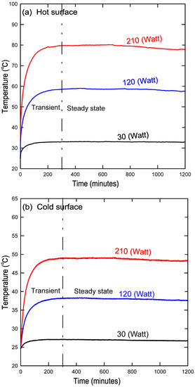 Steady-state condition reached after almost 300 min at the (a) hot copper surface and the (b) cold copper surface.