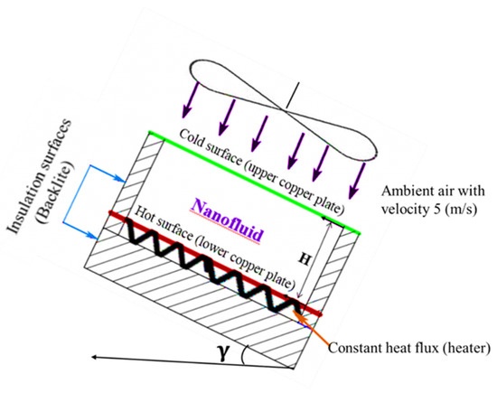 Heat transfers occurred through the constant heat flux heater by conduction via the lower copper plate, natural convection through the nanofluid inside the cavity, conduction through the top copper plate, and by forced convection through ambient air. In addition, the amount of heat that may be lost through the sides and the bottom of the Bakelite plate were calculated. The heat lost by conduction through the Bakelite plate below the heater and from the Bakelite sides was obtained as 3.1% and 7.9% at most, respectively. Figure 5 shows a schematic of the experimental setup with boundary conditions, where the lower copper surface was subject to a constant heat flux, the side walls were insulated, and the upper copper surface was subject to ambient air at 5.0 m/s. The heat transfer by radiation was ignored since the maximum temperature of the nanofluid did not exceed 80 °C and the working fluid was water [40]. The amount of heat transfer can be calculated from Equations (3)–(5).
