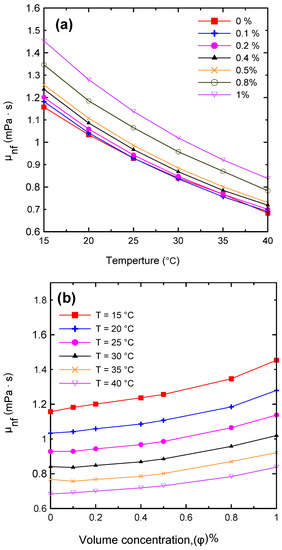 Variations in the nanofluid’s dynamic viscosity with (a) temperature and (b) volume concentration.