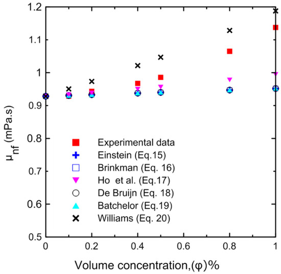 Comparison of the experimentally measured dynamic viscosity and various viscosity models for Al2O3–water nanofluid.