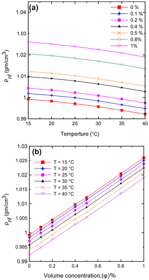 The density of the nanofluids for the experimental results as a function of (a) temperature and (b) volume concentration.