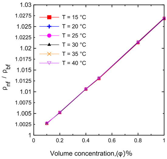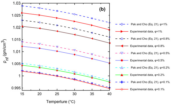 Comparison of the density values between the experiments and Equation (21) of Pak and Cho [53] for Al2O3–water nanofluid.