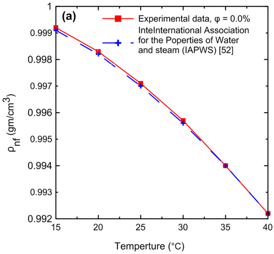 Comparison of the density experimental results for (a) pure water with (IAPWS) [52] and (b) nanofluid at different concentrations using the theoretical density Equation (21) of Pak and Cho [53].