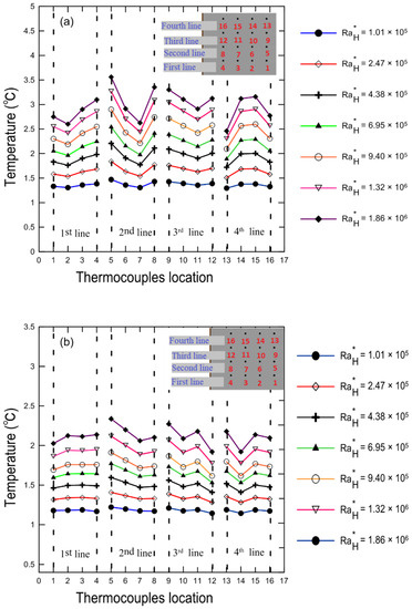 Temperature profiles along the thermocouple location on the copper surfaces at a tilt angle for κ = 0.033: (a) the hot bottom surface; (b) the cold top surface.