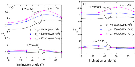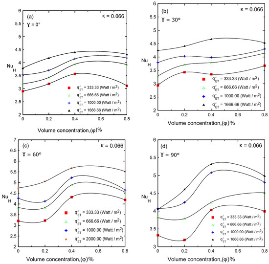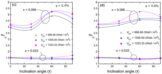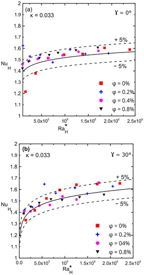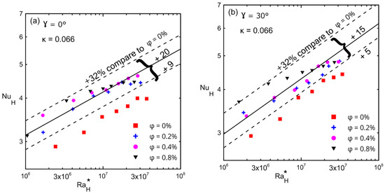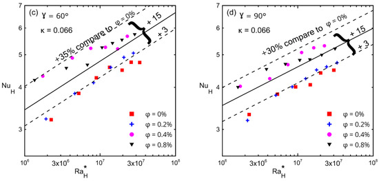 The average Nusselt number with respect to the modified Rayleigh number is shown in Figure 15, (a) γ = 0°, (b) γ = 30°, (c) γ = 60°, and (d) γ = 90° for different inclination angles and for different volume concentrations (ϕ) for the large enclosure (#1, κ = 0.066). The lower and upper dashed lines in these figures present the minimum and maximum enhancements in the Nusselt number over that of a zero concentration (symbol ■). The solid lines in these figures present the average enhancement due to the fact that all concentrations (greater than 0%) were between the minimum and maximum enhancements. Table 11 presents the minimum, maximum, and average enhancement of Nusselt numbers corresponding to different inclination angles for all concentrations. Furthermore, Table 11 shows the percentage of enhancement in the Nusselt number corresponding to each concentration with respect to a zero concentration at different angles. These figures also show that as the modified Rayleigh number increased, the convection velocity increased too, which led to more kinetic energy that allowed the Brownian motion to be more effective [23,24,25,29,30]. This figure indicates that the average enhancement reached a maximum at 0° (20%) and then reached a uniform enhancement of 15% at the other tilt angles for all concentrations at all range of the modified Rayleigh numbers.