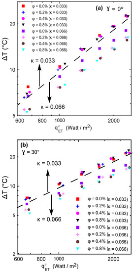 A comprehensive review of studies on free convection in a cavity was carried out by Pandey et al. [14]. The shape effect of the internal cavity, such as a square, circular, and elliptical cylinder, on free convection heat transfer was summarized. Free convection heat transfer inside two water-filled square enclosures was investigated experimentally by Ali et al. [15]. Two different aspect ratios, κ (length/height) = 7.143 and 12.0, were used. The Nusselt numbers was correlated with the modified Rayleigh numbers for both enclosures in the range . They observed that the Nusselt number increased with an increase in the modified Rayleigh number for each of the two enclosures with a higher Nu at a small aspect ratio (κ = 7.143). Almuzaiqer et al. [16] investigated the effect of tilt angle on free convection inside an enclosure filled with water. The Nusselt number reached a maximum at 60° at a fixed modified Rayleigh number for all four tilt angles considered: 0°, 30°, 60°, and 90°. The Nusselt number was found to be higher at any tilt angle other than at a zero tilt angle with an enhancement range of 7.92–62.38%, depending on the modified Rayleigh numbers and the tilt angle. The same trend was observed through other numerical studies [17,18,19] that showed that the Nusselt number reached its maximum at a certain tilt angle and then decreased again. Ma et al. [20] used numerical simulations and parameter sensitivity analyses to investigate the performance of fluid flow and heat transfer in rectangular microchannels including the key physical properties of the fluids and the different parameters of the microchannels. They found that at low Reynolds number conditions, the number of channels and the Reynolds number have a significant impact on heat transfer. However, when the Reynolds number increases, the number of channels is the key factor influencing the heat transfer and flow in microchannel heat sinks. Zhao et al. [21] presented a comprehensive overview of graphene-based studies of energy conversion, energy storage, and heat transfer. A nanofluid of graphene nanoparticles can also be effectively used in heat exchangers and other heat transfer devices. In their review, they reported that when hybrid graphene nanoplatelets and silver in a water base fluid were used in the rectangular duct, the maximum Nusselt number enhancement was 32.7% and the friction factor increased by 1.08 times at 0.1% concentration (by mass) and a Reynolds number of 17,500. Hu et al. [22] investigated experimentally and numerically the natural convection heat transfer in a vertical square enclosure filled with an alumina nanofluid. Their study showed an enhancement of 2% in the Nusselt number at a low nanoparticle concentration of a 1% mass fraction. However, at a 2% concentration, they found no enhancement and a degradation occurred at a 3% concentration. Ali et al. [23,24] investigated natural convection heat transfer in vertical circular cavities using Al2O3–water nanofluid at different volume concentrations for heating either from the top or the bottom of the cavity. While heating from the top, alumina–water nanofluid had a lower Nusselt number than the base fluid. On the other hand, when heating from the bottom, the heat transfer coefficients increased with an increase in the volume concentration up to a maximum point; then, they decreased as the volume concentration increased further. The heat transfer coefficient increased by a maximum of 40% for the shallow enclosure at κ (height/diameter) = 0.0635 and only by 8% for κ = 0.127. Solomon et al. [25] studied the effect of cavity aspect ratio on free convection in alumina–water nanofluid-filled rectangular cavities. The aspect ratio of the cavity has an impact on both the heat transfer coefficient and the Nusselt number. A total of seven volume concentrations (0.0%, 0.1%, 0.2%, 0.3%, 0.4%, 0.5%, and 0.6%) were used at a set of temperatures (∆T = 20, 30, 40, and 50 degrees Celsius) between cold and hot surfaces. At low concentrations, nanofluids demonstrated a slight increase in Nu over that of the base fluids, up to 5%, whereas at high volume concentrations, a decrease in Nu was observed. Choudhar and Subudhi [26] investigated turbulent free convection in an Al2O3–water-filled cavity with different aspect ratios of 0.3–2 and 5 for Rayleigh numbers in the range of 107 < Ra < 1012 for very low volume concentrations of 0.01% and 0.1%. It was observed that Nu was enhanced by 29.5% for lower particle concentrations, 0.01 vol.%, where deterioration was caused by increasing the viscosity and decreasing the Brownian motion. The effect of inclination angles on free convection in an enclosure filled with Cu–water was numerically analyzed by Abu-Nada and Oztop [27]. An enhancement was observed in the Nusselt number of approximately 33% at a 90° tilt angle with a Rayleigh number of 1000 and for a 0.1% nanofluid concentration. Heris et al. [28] studied the free convection in a cube with a side length of 100 mm. The effect of the tilt angle on free convection was observed. Their study used 0°, 45°, and 90° tilt angles and various types of nanofluids of Al2O3, TiO2, and CuO with turbine oil as a base fluid. However, the influence of the inclination angle on the aspect ratio was not examined. They concluded that no enhancement was observed when using different nanoparticles in turbine oil as a base fluid. In other words, the Nusselt numbers of turbine oil as a base fluid were higher than other nanofluids using turbine oil as a base fluid. The natural convection of double-walled carbon nanotubes–water nanofluid in a cuboid cavity was experimentally and numerically studied in [29] at a set of different temperatures. It was observed that the heat transfer coefficients and Nusselt numbers reached a maximum at a 0.05% concentration and then decreased as the volume concentration increased. The natural convection heat transfer of SiO2–water nanofluid in