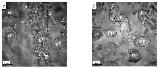 TEM images of (a) 30 w/70 w, (b) 50 w/50 w, and (c) 70 w/30 w TRG/PP/PE composites, and (d) 30 w/70 w, (e) 50 w/50 w, and (f) 70 w/30 w (TRG/PP)/PE composites. The content of TRG was 2.0 wt% in all samples. The white arrows indicate TRG.