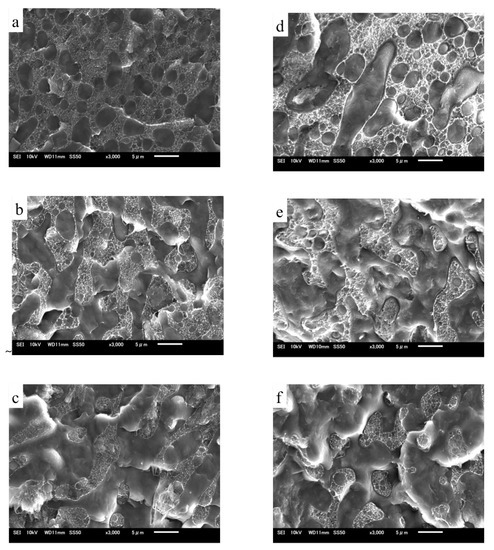 SEM observations were also performed to determine the phase morphologies of the TRG/PP/PE and (TRG/PP)/PE composites. Figure 2 shows SEM micrographs of fractured surfaces of TRG/PP/PE and (TRG/PP)/PE composites of different compositions. The rough part in each image corresponds to the PE phase, owing to its higher crystallinity, while the smooth part corresponds to the PP phase. The TRG/PP/PE and (TRG/PP)/PE composites showed similar changes in morphology with composition. At a PP content of 30 wt% (Figure 2a,d), the rough PE matrix was a continuous phase, and contained many dispersed droplet-like minor PP phase domains. For the 50 w/50 w PP/PE blends (Figure 2b,e), the PE and PP phases formed a co-continuous morphology. At a PP content of 70 wt % (Figure 2c,f), discrete minor PE components were observed in the PP matrix. However, compared with the (TRG/PP)/PE 70 w/30 w composite, which exhibited many minor PE spheres dispersed in a continuous PP phase (Figure 2f), the 70 wt% PP TRG/PP/PE composite contained a larger amount of the co-continuous-like PE structure coexisting with the island-like PE structure (Figure 2c). Similar results were observed for other PP/PE compositions; the PP domains were larger in the (TRG/PP)/PE composites than in the TRG/PP/PE composites at same composition. The above TEM observations revealed the differing localization of the TRG in the PP/PE blends: Most of the TRG was selectively dispersed in the PE phase of the TRG/PP/PE composites but was randomly dispersed in both the PE and PP phases of the (TRG/PP)/PE composites. This caused the TRG/PP/PE composites to have a relatively higher PE melt viscosity owing to the higher TRG concentration of the PE phase, which enlarged the phase continuity of the PE domains in these composites [23,24]. The roughness of the fractured surface of the PP domains observed in Figure 2d–f was greater than that in Figure 2a–c. This indicates that more TRG was distributed in the PP phase in the (TRG/PP)/PE composites. Moreover, larger cavities along the interface were observed in the (TRG/PP)/PE composites, which may have been caused by some of the TRG located at the PP/PE blend interface (shown in Figure 1d–f).