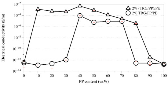 Electrical conductivity versus PP content for TRG/PP/PE and (TRG/PP)/PE composites. The content of TRG in the polymer blends was 2.0 wt%.