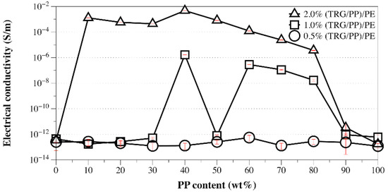 Electrical conductivity versus PP content of 0.5 wt%, 1.0 wt%, and 2.0 wt% TRG filled (TRG/PP)/PE composites.