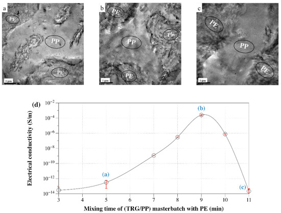 TEM micrographs of 1.0 wt% TRG filled (TRG/PP)/PE composites with different mixing time of the TRG/PP masterbatch with PE: (a) 5 min, (b) 9 min, and (c) 11 min. (d) Electrical conductivity versus mixing time of the (TRG/PP) masterbatch with PE for 1.0 wt% TRG filled (TRG/PP)/PE 50 w/50 w composite.