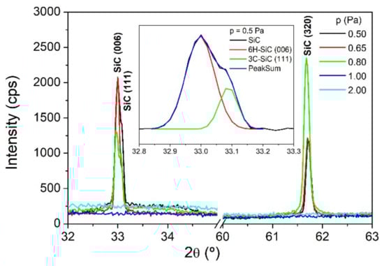 XRD patterns of SiC thin films deposited under different gas pressures. The inserted graph displays the deconvolution of the SiC peak (2θ = 33°) observed for the sample deposited at 0.5 Pa.