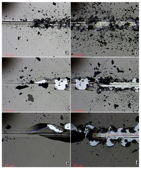 Generally, the produced SiC films exhibited good cohesion, since no cohesive failures (cracks in the coatings) were detected at the beginning of the scratch tests prior to adhesive failure. Figure 6 presents optical micrographs of different stages (LC2—left micrograph column, and LC3—right micrograph column) showing the dynamics of the SiC film—Si substrate system failure and the impact of the working gas pressure on the coating/substrate interfacial behavior.