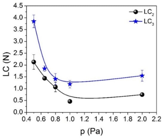 The variation of critical adhesion loads (LC2—adhesive failure, and LC3—delamination failure) as a function of the working pressure for SiC thin films deposited by the DCMS/HiPIMS co-sputtering technique on silicon substrates.