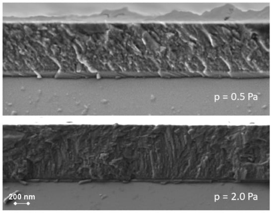 The H3/E2 ratio helps to estimate what happens in terms of dissipation of energy when the film suffers plastic deformation under a certain load []. The obtained results match the results of the H/E ratio. The films with higher resistance to elastic deformation, produced under p = 2.0 Pa argon pressure, are those that dissipate more energy when plastic deformation occurs. The H/E2 ratio gives information about the resistance of the material to permanent damage []. The variation of this ratio as a function of the deposition pressure (not shown here) is the opposite of the other two ratios. Those films exhibiting lower resistance to elastic deformation are those that may have higher resistance to permanent damage, according to these ratios.