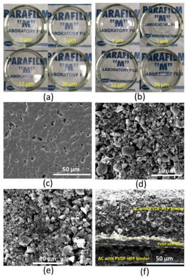 Photographs of PVDF-HFP films of various thicknesses: (a) dry films and (b) films soaked with 1 M TEABF4 in acetonitrile. SEM images: (c) 12 μm PVDF-HFP film, (d) activated carbon electrodes with PVDF binder, (e) activated carbon electrodes with PVDF-HFP binder and (f) cross-section of the electrode/PVDF-HFP film/electrode sandwich (PVDF-HFP as the binder in the electrodes).