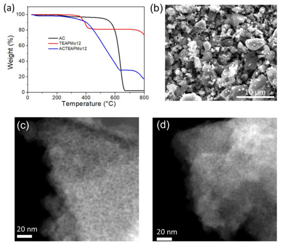 (a) The thermogravimetric curves of AC, TEAPMo12 and AC/TEAPMo12. (b) SEM image of AC/TEAPMo12. HAADF-STEM images of (c) AC and (d) AC/TEAPMo12.