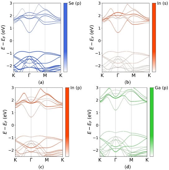 - Magorrian, S.J.; Zolyomi, V.; Fal’ko, V.I. Electronic and optical properties of two-dimensional InSe from a DFT-parametrized tight-binding model. Phys. Rev. B 2016, 94, 245431. [Google Scholar] [CrossRef] [Green Version]