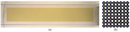 The porous area is formed by repeating (150 times) a 2 × 2 mm2 square (Figure 1b). The arrangement of channels in a square represents a grid of 8 × 8 channels, which have an almost circular cross-section (the channel depth and width are 100 and 110 µm, respectively). The channels in the grid have constrictions or “pores” that are randomly distributed to imitate the natural structure of the rock. The grid contains 38 pores with Ø63 µm, 40 pores with Ø85 µm, and 50 straight channels. Additional parameters are presented in Table 1.