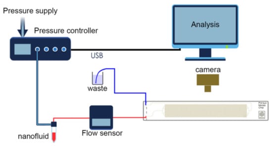 The schematic diagram of the experimental setup is shown in Figure 3. The displacement fluid flow was controlled using Elveflow OB1 MK3+ multi-channel high-performance microfluidic pressure controller. The controller was equipped with two pressure channels from 0 to 2000 mbar, and from 0 to 8000 mbar. For the 8-bar channel, the accuracy of maintaining pressure was 100 Pa; the response time and pressure setting time were up to 9 and 35 ms, respectively, and the minimum pressure increment was 24 Pa. The flow rate and pressure drop were monitored and controlled using the ESI Microfluidic Software from Elveflow.