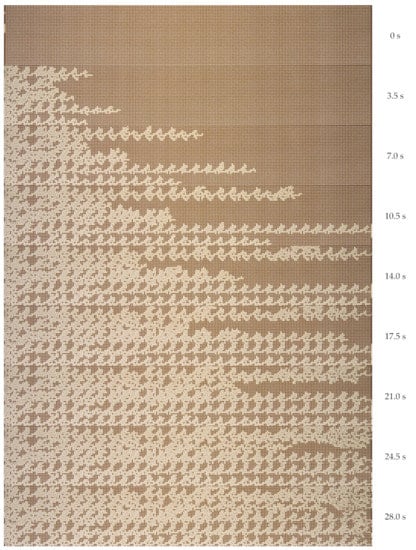 Initially, experimental microfluidic flooding was carried out using water. A microfluidic chip, filled completely with oil, was supplied with water at a volumetric flow rate of 45 µL min−1. The dynamic pattern of the oil displacement process by water is shown in Figure 4. The nature of the immiscible liquid–liquid flow during displacement through a porous medium is determined by the capillary number (the ratio of viscous and capillary forces). In this case, viscous forces prevailed over capillary forces. The capillary number was . Since the viscosity of water is lower than the viscosity of the displaced oil, the interface in the displacement process is unstable. The moving water flow front has a shape of so-called viscous fingers []. Over time, the vicious fingers grow in length. Such fingers quickly break through to the channel exit. The water flows through separate channels. Further water flow occurs through separate channels. At that, approximately 40% of the initial volume of oil remains in a porous medium. After the main viscous fingers have reached the channel exit, the flow process becomes stationary. Further flooding of the microfluidic chip does not lead to an increase in the oil recovery factor. The last pictures of Figure 4 show the steady distribution of oil saturation.
