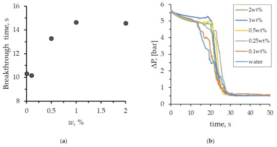 (a) The breakthrough time of the suspensions, depending on the concentration of nanoparticles; (b) Pressure drop in the microfluidic chip during oil displacement.