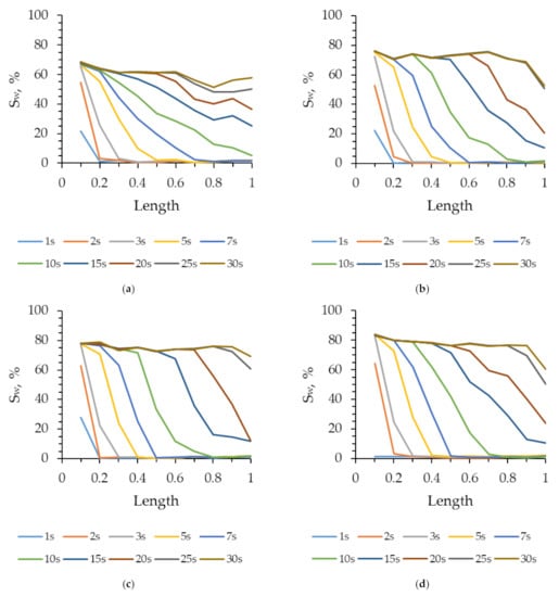 For a detailed analysis of the displacement process in the microfluidic chip, the latter was divided into 10 equal regions along the length of the microporous medium. The saturation of the displacing fluid () was determined in each of these regions. Figure 8 shows the saturation distributions of water and 2 wt% of the SiO2 suspension along the length of the microfluidic channel (normalized by the length of the microporous medium) at various points in time. It can be seen from Figure 8 that, firstly, saturation during flooding with water and suspension at the beginning of the microfluidic chip quickly reach a plateau and do not change further. Secondly, the saturation of water in the microfluidic chip is distributed more evenly along the length of the microfluidic chip than that of 2 wt% SiO2 suspension. This can be seen from the slope of the saturation distribution curves of the displacing fluid at the same time points, shown in Figure 8. Thirdly, in each subsequent region of the micromodel, the water saturation reaches a steady maximum value more slowly. At that, the maximum steady-state saturation of water at the initial part of the chip was 67%, while the saturation of 2 wt% of SiO2 suspension reached 83%. Moreover, it should be noted that the further that the considered area is from the input, the lower the established water saturation level of the displacing fluid is.