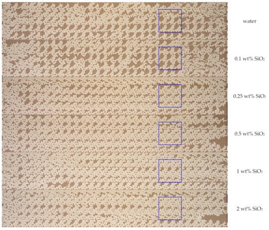 The analysis of the final distribution patterns of the oil fraction in the micromodel showed a significant difference obtained when displacing with water and suspensions (Figure 9). A significant residual oil saturation remains in the washed-up zone during displacement by water. Here, the oil remains in the form of large areas filled with oil, which is retained by capillary forces. Using SiO2 suspensions reduces the residual oil saturation. Figure 10 shows the enlarged areas of the micromodel (see the blue frame in Figure 9) with a size of 6 × 6 mm2, demonstrating the effect of the nanoparticle concentration on the residual fraction of oil in the micromodel. As a result of the process of displacement by SiO2 suspensions, the size of large areas, filled with oil, decreases. At that, this effect strengthens with an increase in the concentration of SiO2 nanoparticles in the suspension.