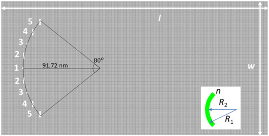 Although a weak antifocusing/antilocalization can be observed in the configurations in Figure 1, the effect is not strong enough. We have, therefore, considered further several geometries of rectangular nanopores with well-defined edge types (and hydrogenation) in order to maximize the phenomenon, and have identified the arrangement illustrated in Figure 2 as the one that maximizes the focusing/antifocusing effect. The geometry is similar to that considered previously, in the sense that there are nine nanopores with zig-zag edges along the width of the GNR and armchair edges along its length, arranged symmetrically on an arc of a circle with the same radius r = 91.72 nm, subtending an angle of 80°; the angle between nanopores is thus also of 10°, the distance between their centers being of 16 nm along the length of the arc. The difference with respect to the previously studied configurations is that the nanopores are no longer identical: the central one, numbered 1 in Figure 2, and the nanopores denoted by 3 have an almost square shape, while the nanopores labeled as 2, 4 and 5 have a rectangular shape. The center of the circular arrangement of nanopores is situated at 30 nm from the left side of the structure and at half width. Note that the widths of the nanopores along the propagation direction of charge carriers are significantly reduced, favoring wavefunction tunneling at the nanopores, and hence increased transmission. Only in this way can the phase information of the incident wavefunction, essential in determining constructive interferences responsible for focusing, be (at least in part) preserved; otherwise, as shown in the examples above, the wavefunction pattern is a result of strong scattering by the nanopores’ edges, independent of their shape. After reducing the dimensions of nanopores along the propagation axis to about one-fourth of the initial value, we analyzed arrays of nanopores with different dimensions along the transverse direction and with well-defined edge types. Several configurations with almost square and rectangular nanopores were investigated, the nanopores in the central area (nanopores 1 to 3) being found to have a higher degree of influence on the wavefunction distribution. Finally, we found that the nanopore array configuration in Figure 2 has the strongest effect on the spatial distribution of the wavefunction.