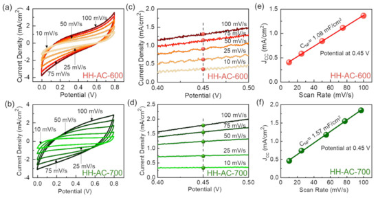 CV curves of the (a) HH-AC-600 and the (b) HH-AC-700 electrodes. CV curves at the Non-Faradaic region near 0.45 V for the (c) HH-AC-600 and the (d) HH-AC-700 electrodes. JCC as a function of the scan rate for the (e) HH-AC-600 and the (f) HH-AC-700 electrodes.