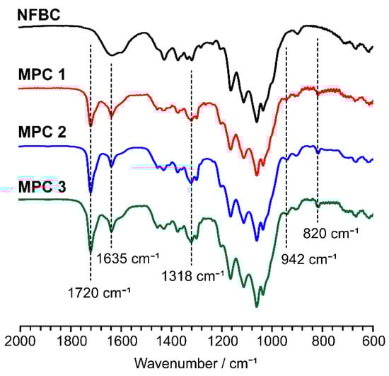 Figure 1 shows FTIR spectra of MPC 1–3 and NFBC as starting materials. Compared to the FTIR spectrum of NFBC, the spectra of the MPC samples exhibit additional adsorption bands at 1720, 1635, 1318, 942, and 820 cm−1 that correspond to C=O stretching, C=C stretching, Si–C bending, C=C out-of-plane bending, and Si–O stretching vibrations, respectively [,]. These adsorption bands in the FTIR spectra of the MPC samples reveal that the silane coupling reaction between NFBC and MPTMS proceeded in aqueous solution; the three methoxy groups of MPTMS were solvated by the acid catalyst, and the formed silanol groups reacted with the hydroxyl groups of cellulose to modify the NFBC surface. In addition, the intensities of the new absorption bands were observed to gradually increase as the amount of MPTMS used to prepare the MPC samples was increased, which indicates that the degree to which the NFBC surface is chemically modified depends on the MPTMS concentration in the reaction mixture.