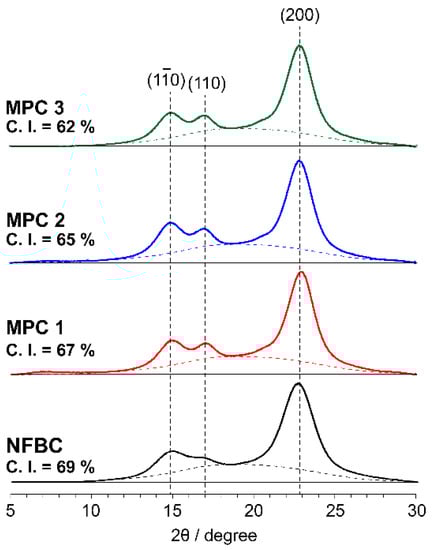 XRD patterns of NFBC and MPC 1–3 were recorded at 298 K on a Bruker D8 Advance diffractometer (Bruker AXS GmbH, Karlsruhe, Germany) using Ni-filtered CuKα (λ = 1.54056 Å) radiation generated at 40 kV and 40 mA, and at scan rate of 1.000°/min in the 5–35° 2θ range. The crystallinity indices (CIs) of these samples were calculated from the areas of their crystalline cellulose peaks relative to the total areas of their crystalline + amorphous cellulose peaks [,,]. TOPAS software (Ver. 4.2, Bruker AXS GmbH, Karlsruhe, Germany) was used to fit the X-ray diffractograms by using a non-linear least-squares fitting [].