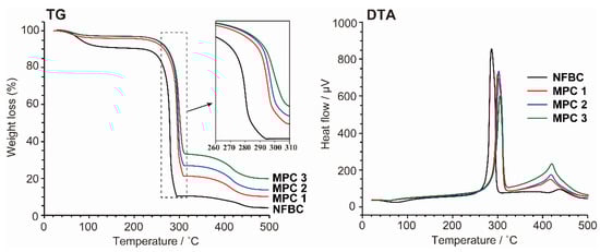 Figure 4 shows TG/DTA data for MPC 1–3 and NFBC. As previously reported, NFBC thermally decomposes through two weight-loss stages: the first (70–140 °C) involves the vaporization of adsorbed water from cellulose chains, while the second (270–290 °C) involves the pyrolytic dehydration and decomposition of cellulose molecules [], and exhibits a clear endothermic DTA peak at 280 °C. Although MPC 1–3 exhibit similar thermal behavior to that of NFBC, they lose much less weight at 70–140 °C than NFBC, which is consistent with MPC-surface hydrophobization resulting from silane coupling leading to fewer interactions between water molecules and the surface. In addition, the MPC samples exhibit second weight losses due to cellulose pyrolysis that are shifted to higher temperatures than that of NFBC. The decomposition temperature appears to increase with increasing MS, as confirmed by a shift in the endothermic DTA peak to higher temperatures. Moreover, the TG traces of the MPC samples show clear weight losses between 390 and 440 °C, with DTA endothermic peaks detected at 419 °C, which is believed to correspond to the decomposition of the stable siloxane structure formed on the NFBC surface. Based on these thermal analysis data, we conclude that the silane layer on the NFBC surface blocks thermal conduction and increases the pyrolysis temperature of cellulose [].