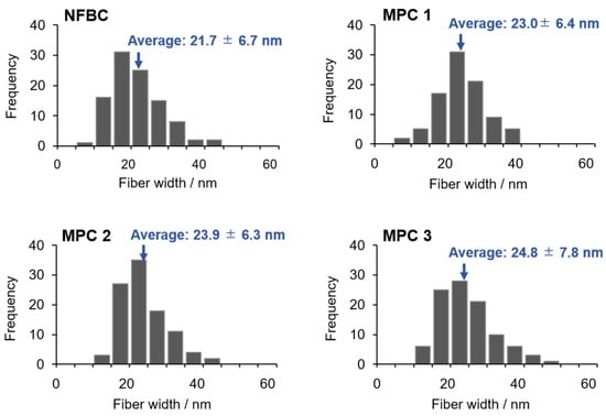 Fiber-width distributions (n = 100) of NFBC and MPC 1–3 determined from the scanning electron microscopy (SEM) images in Figure 5.