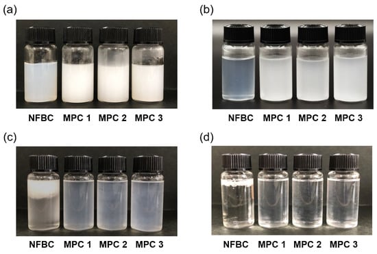Dispersion states of MPC 1–3 and NFBC: (a) 1.0% w/v in water, (b) 0.1% w/v in water, (c) 1.0% w/v in chloroform, and (d) 0.1% w/v in chloroform.