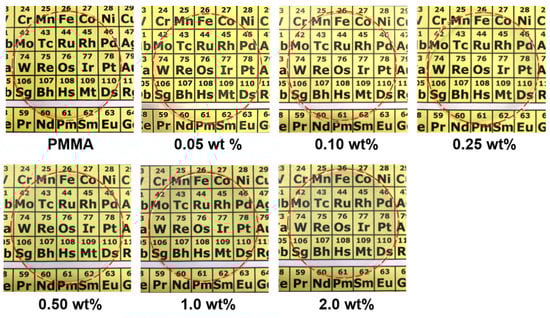 Photographic images of ~0.5-mm-thick PMMA composite sheets containing 0.05, 0.10, 0.25, 0.50, 1.0, and 2.0 wt% MPC 1, with neat PMMA as a reference, overlaid on the periodic table. The perimeter of each sheet is indicated by a red circle.