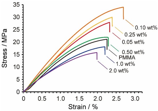 Tensile stress–strain curves for PMMA composites containing 0.05, 0.10, 0.25, 0.50, 1.0, and 2.0 wt% MPC 1, with that for PMMA provided as a reference.