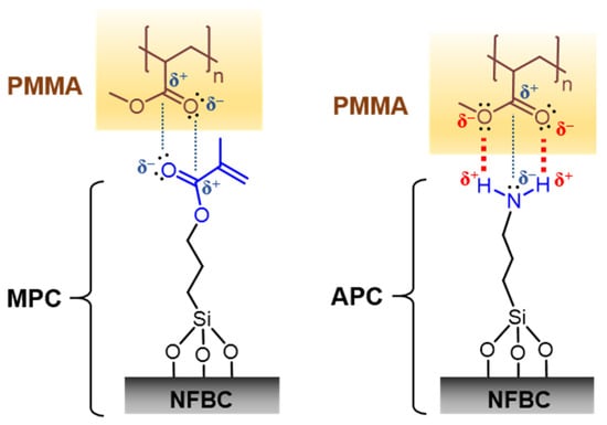 Differences in the molecular structures of NFBCs modified with MPTMS (left, MPC) and APTMS (APC, right), and intermolecular forces formed with PMMA.
