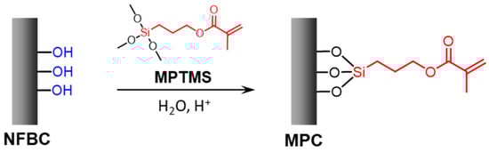 Scheme showing how the nanofibrillated bacterial nanocellulose (NFBC) surface is modified with 3-(methacryloyloxy)propyltrimethoxysilane (MPTMS). Surface hydroxyl groups are silylated with MPTMS in aqueous solution to form 3-(methacryloyloxy)propyltrimethoxysilylated nanocellulose (MPC).