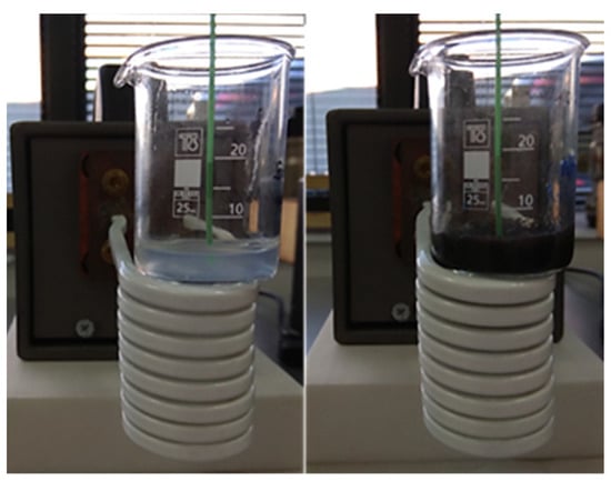 The magnetite magnetic nanoparticles used to carry out the experiments presented in the work were fabricated using the method of chemical coprecipitation. Chemical reagents with high purity were purchased from the Merck Chemical Company, Darmstadt, Germany. Optimum synthesis was done by adding 5 g of ferrous sulfate heptahydrate and 7.1 g of ferric sulfate 9-hydrate into 400 mL of distilled water in a ratio 1:2. The reaction was maintained for 30 min at 70 °C under stirring and, for the conversion of excess iron species into Fe3O4, 2M of NaOH solution was added (~50 mL of NaOH). The precipitate was washed with distilled water (three times) and left to dry at 40 °C. The magnetic characterization of MNPs was achieved with a vibrating sample magnetometer (VSM) at 300 K under a static applied field of 1 T. The saturation magnetization was found equal to 96.3 emu/g. The magnetization versus magnetic field, M(H), dependence is shown in Figure S15 of the Supplementary Materials, where the hysteresis loop was measured at 1 T.