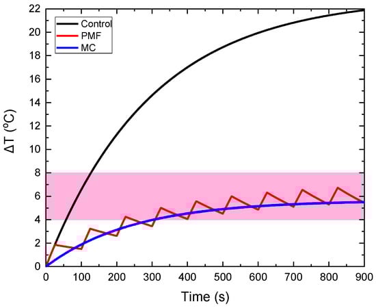 Illustration of the feasibility of our method. The control ΔT curve corresponds to the classical MPH method and is compared to the ΔT curves obtained from MC and PMF methods under 8 cm maximum coil displacement and 25% Duty Cycle, respectively. The magnetic field at the measuring point of temperature was equal to 60 mT, as shown by the field simulations of Figure S2a in the Supplementary Materials. All ΔT curves correspond to the CTP sample.