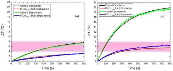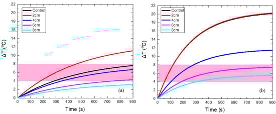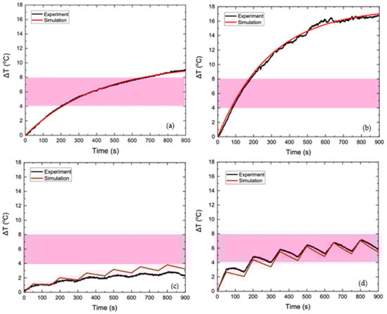 In all the curves, the MPH characteristic window (41–45 °C) in the diagrams is between 4 and 8 °C, since the increase of the temperature ΔΤ is studied here and the initial temperature is considered 37 °C.