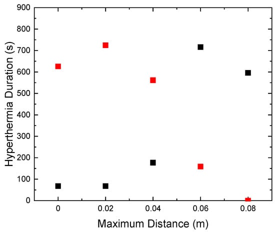 The characteristic effective time for which the sample is retained within the MPH window is denoted here as Hyperthermia Duration. A comparison between the total time that the HTP (red points) has a temperature above 41 °C and the Hyperthermia Duration of the CTP sample (black points) is depicted in Figure 5. The desired results are those for which these two parameters get their lowest and highest value, respectively. Therefore, it clearly comes out that the maximum displacement of 8 cm is considered as the optimum one, since the HTP sample is spared—its temperature not exceeding 41 °C (ΔΤ < 4 °C)—and, at the same time, the CTP sample remained in the MPH window (4–8 °C) for almost 600 s.