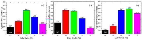 Hyperthermia Duration of CTP (written at the top of column) and HTP (at the bottom) as a function of Duty Cycle for (a) 45 mT, (b) 60 mT, and (c) 70 mT. The various Duty Cycles were evaluated with two criteria: (i) HTP sparing, i.e., its temperature should not exceed the value of 41 °C and (ii) the maximum Hyperthermia Duration for the CTP sample. After this evaluation, the final optimal values of Duty Cycle were found for each magnetic field used (45, 60 and 70 mT). The Duty Cycles equal to 20%, 25%, 33%, 50% and 67% are presented with purple, blue, green, red and black color respectively in (a,b). In (c) The Duty Cycles equal to 17%, 20%, 25%, 33% and 50% are presented with purple, green, blue, red and black color respectively.