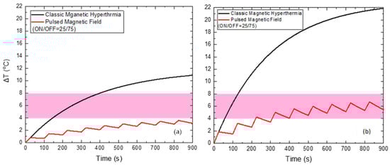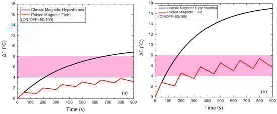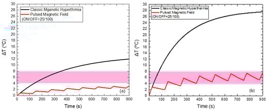In order to test the reliability of the proposed strategy, the numerical results were compared to the corresponding experimental ones, as obtained in [23] after temperature measurements, by applying either a continuous AMF or a PMF of 45 mT, as shown in Figure 11.