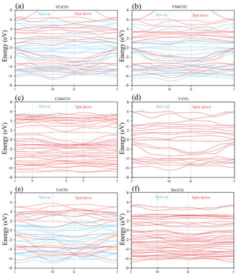 As for M’MCO2 with AFM configurations, near the Fermi level, the valence band and the conduction band of Mn2CO2 are clearly separated, and no band curve crosses the Fermi level. Moreover, the top valence band is near the point M (0.622), and the bottom conduction band is near the point K (1.358), illustrating that Mn2CO2 is an indirect band gap semiconductor, a finding that is in keeping with the results of Zhou [55]. Meanwhile, both CrMnCO2 and V2CO2 have band curves crossing the Fermi level, and their top valence band and bottom conduction band are located at the point Γ, with a small band gap width, showing metallic character. With regard to M’MCO2, with FM configurations, it can be seen from Figure 5a,b,e that the red curves (spin-down) are distributed on both sides of the Fermi level, with large band gap widths, while the blue curves (spin-up) are densely distributed, crossing the Fermi level. The electronic states with spin-up make the band gap narrow—these are metallic materials. On the whole, we concluded that, when M is replaced with M’—causing non-Janus MXene to become Janus MXene—the band gap width was greatly reduced and the conductivity became better; therefore, Janus MXenes can regulate the band gap.
