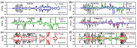 DOS of M’MCO2. (a) V2CO2; (b) VCrCO2; (c) Cr2CO2; (d) VMnCO2; (e) Mn2CO2; (f) CrMnCO2.