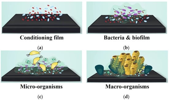 Biofilm formation involves four main stages of colonization. (a) The initial attachment of protein generates biofilm on the material surface; (b) bacteria and other bio-substances are attached to the biofilm; (c) bio-substances are continuously accumulated to create colonization of micro-organisms; (d) accumulation of macro-organisms.